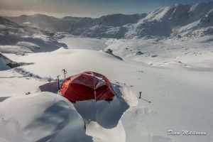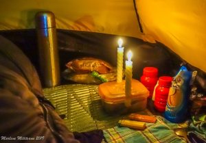 Marlene aprinde cele două lumânări imediat după ce intră în cort, în timp ce eu mă mai ocup de exterior, de verificat eficienţa ţăruşilor, de ancorele suplimentare. În 10-15 minute, temperatura în cort crește, de exemplu de la –10 la +8, +10º C! Așa că putem sta în cort 3-4 ore fără a ne ieşi aburi din gura şi fără a ne îngheţa mâinile, fără a intra în saci! Marlene foloseşte șosetuţe de puf, eu doar îmi schimb şosetele umede cu unele uscate, de lână. Eventual, ne punem un sac de dormit peste picioare, căci pe jumătatea de sus a corpurilor avem pe noi pufoaicele. Nu concep a găti stand în fund în cort şi cu picioarele într-un şanţ în zăpadă făcut în absida cortului cum recomanda unii care se dau experţi în bivuacuri de iarna! Și nici nu gătim din saci, căci unii când intră în cort, intră şi în saci! Noi intrăm în saci după 3-4 ore de la intrarea în cort, deci când ne culcăm şi când dezbrăcăm pufoaicele le băgăm în husele lor de transport şi le vom folosi ca perne! Și atunci stingem lumânările și aerisim cortul. Doar de vreo trei ori în cei 25 de ani anteriori, când gerul era de –18º –22º C şi sacii de dormit mai umezi (a doua sau a treia noapte) am dormit şi cu pufoaicele pe noi.