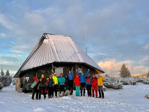 Desigur că nu a urmat un chef până spre ziuă. Nici sticle de golit n-au fost multe. Înainte de plecare, ultimii care au ieșit din Refugiu au făcut chiar exces de zel în a-l lăsa cum l-am găsit, cum dorim să-l găsească (și să-l lase!) și cei care îl vor vizita sau folosi. O ultimă fotografie de grup.  La ora 11 am plecat cu toții la vale, pe unde urcaseră ieri cei opt, printr-un decor de basm. Desigur nu se mai vedeau urmele lor de urcare decât ici-colo. Dar Marius ne-a condus în slalom  printre brăduți și jnepeni ca un adevărat ghid montan. Iar din Poiana Onceasa am continuat spre stânga spre și pe Valea Ponorului, nu pe Valea Alunului pe unde urcaseră ieri. De la Runcu Ars la Cotul Firii am încăput și cei cinci în cele trei mașini ale lor.  Ajunși fiecare acasă, în acea zi și în următoarele, am admirat zeci de imagini și filmulețe postate pe grupul „Revelion la Piatra Tâlharului”, făcute de dragii colegi cu care am petrecut clipe de neuitat.  Un An 2026 cu bucurii și împliniri tuturor !